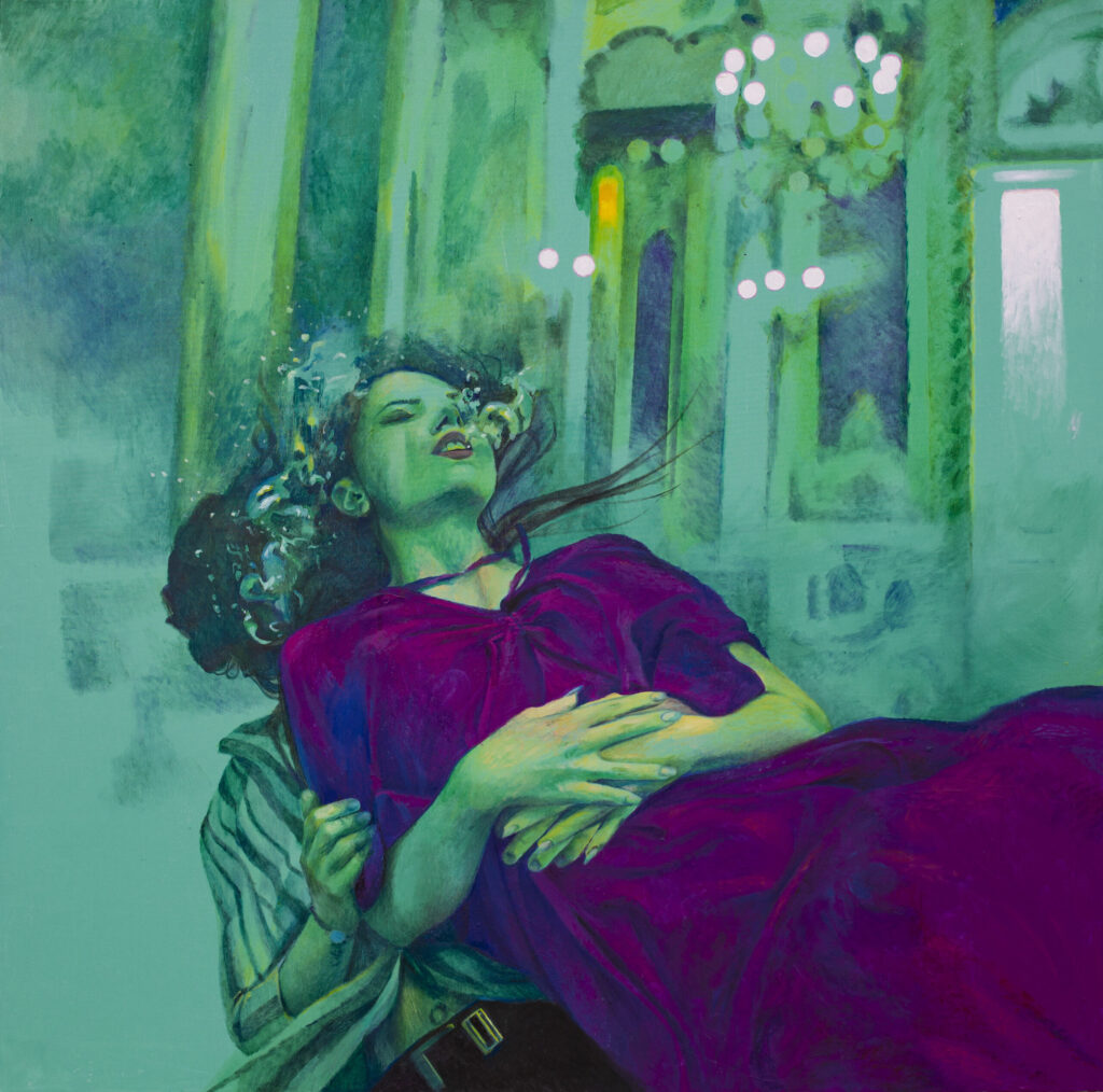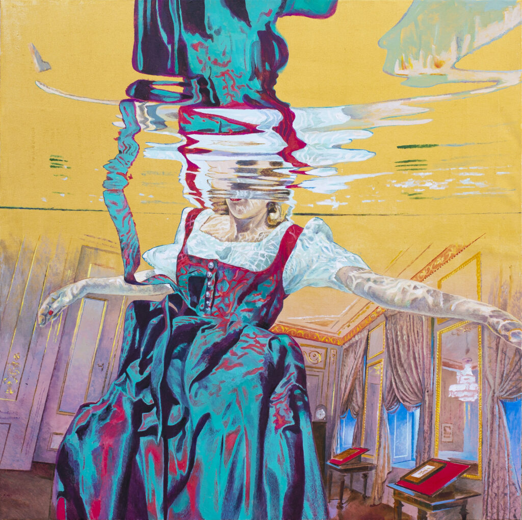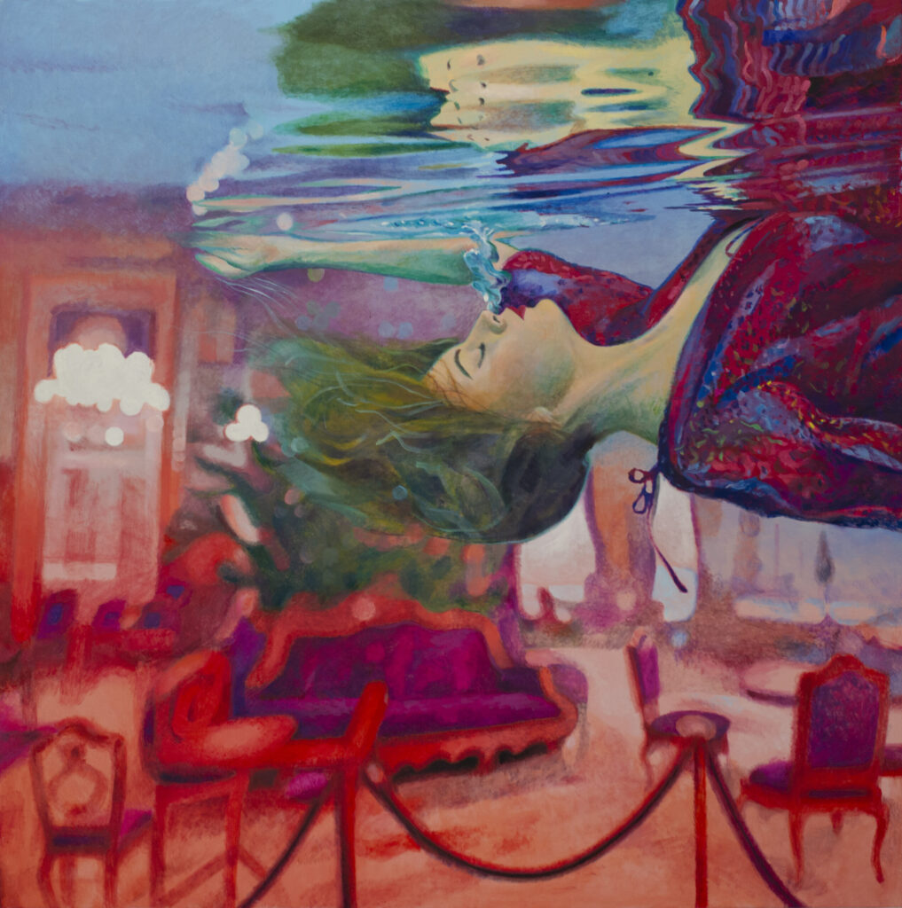 The creative work of Ivana Živić begins with an apparent, observed scene and an isolated detail, and ends with a rich and surreal visual story. Scenographically interpreted as the backdrop of magnificent buildings, the walls between which we move become spaces of desire and contemplation, but also of the need for control and rationalization. By combining the three motifs with which she builds the space of the painting – water, a luxurious interior and a lonely figure, the artist leads the viewer with a sure hand into an artistic narrative that starts from visible reality. Using realism and ambiguity, Ivana Živić achieves an enchanted and poetic atmosphere of the painting, which the presence of water emphasizes with its multiple symbolic meanings. Unreal environments are also rich in symbols, while the clothed figure is in a thoughtful and associative relationship with the space through which he moves without stopping.