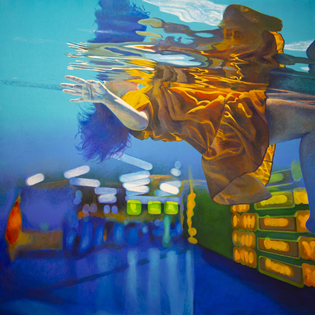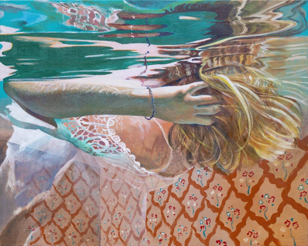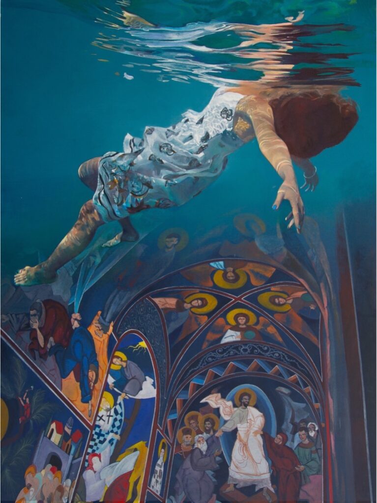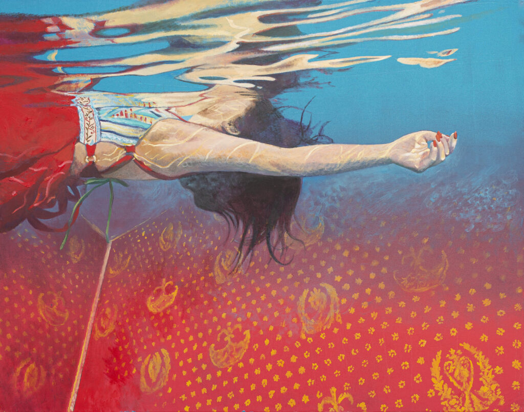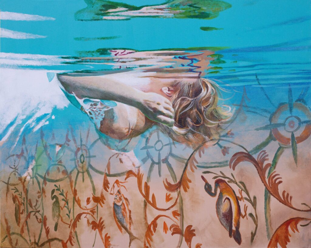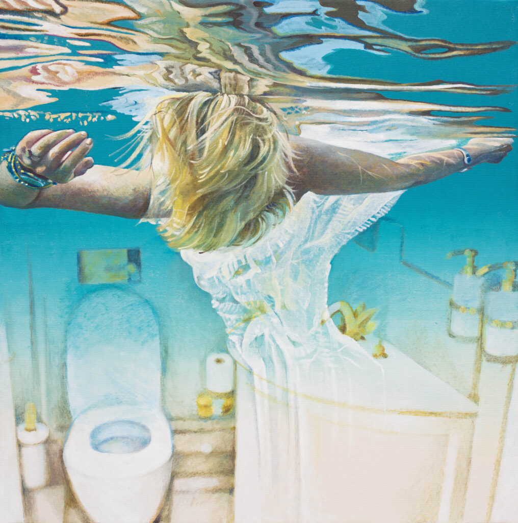 Ivana Živić is certainly not an ordinary painter of realistic motifs, she is different from all the others, among the most original, because she does not use the usual solutions of the new realists. She doesn’t paint hyperrealistically, but has her own expression, she doesn’t explore the enlarged scene and human heads, conventionally speaking the now-favorite portraiture on a large format, which can also be understood as a landscape of the human body and figure. Instead, he composes complex wholes, oil paintings that are very demanding in solving the frog’s perspective, bodily shortening and distortion, optically determined by the refraction of the scene in the water. At first glance, her visual world is realistic in appearance, but conceptually, it is moved to completely unreal, unreal environments, the painting is drowned in an aquatic atmosphere and the bodies are submerged in a watery labyrinth.