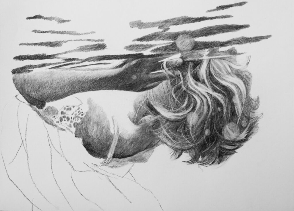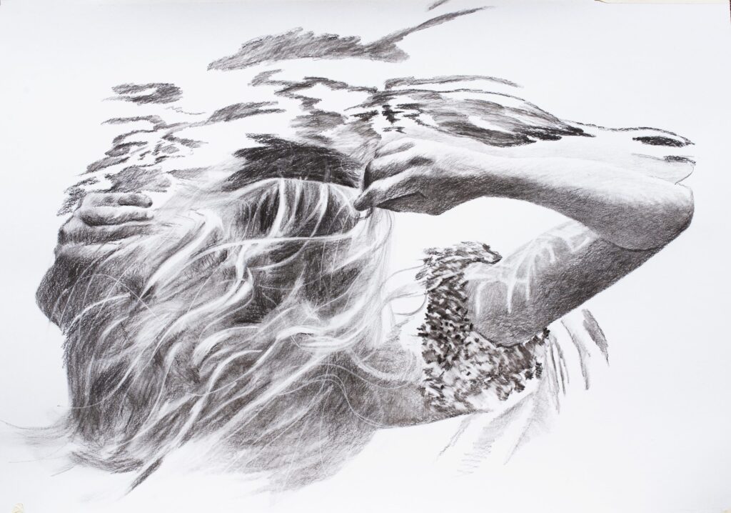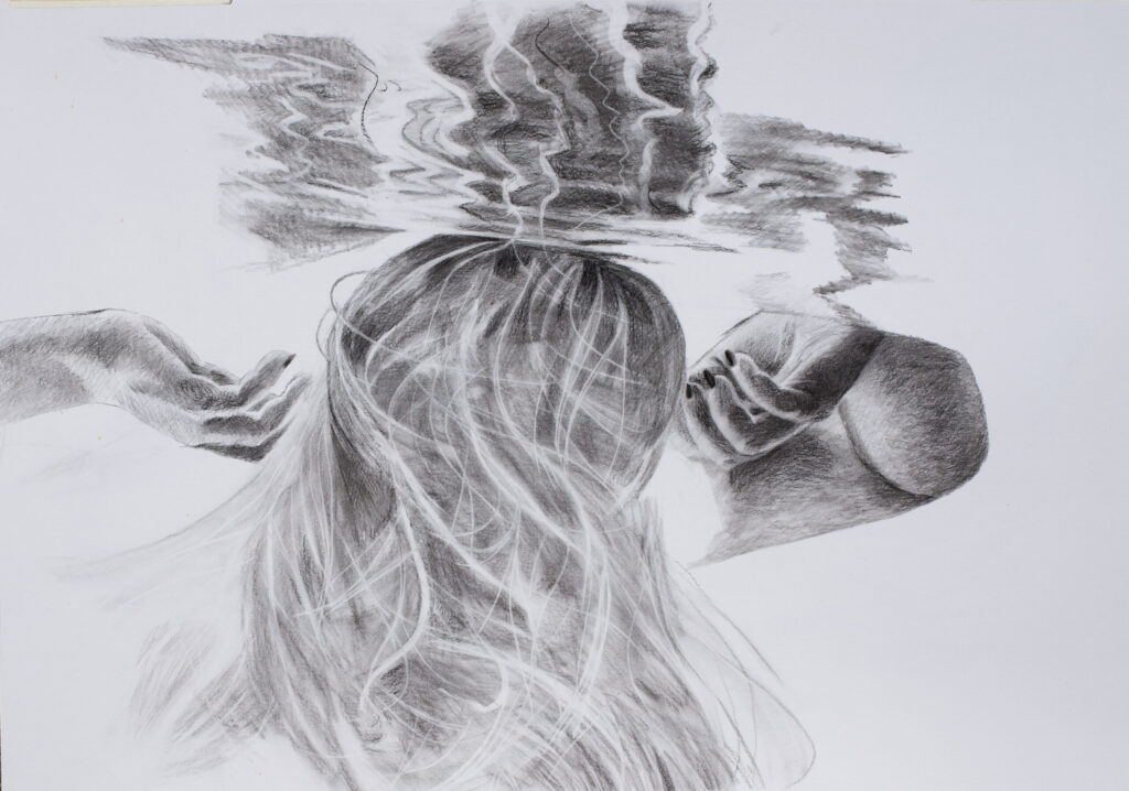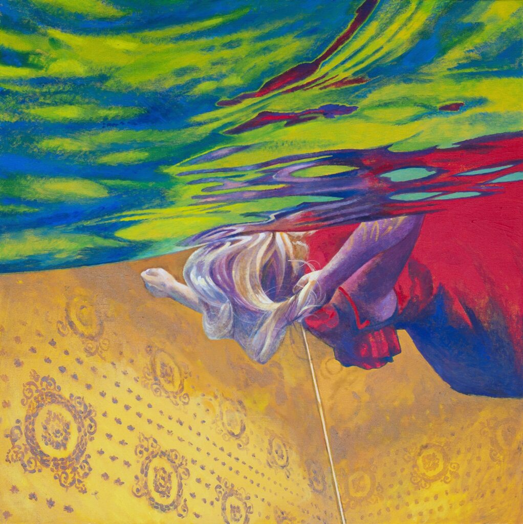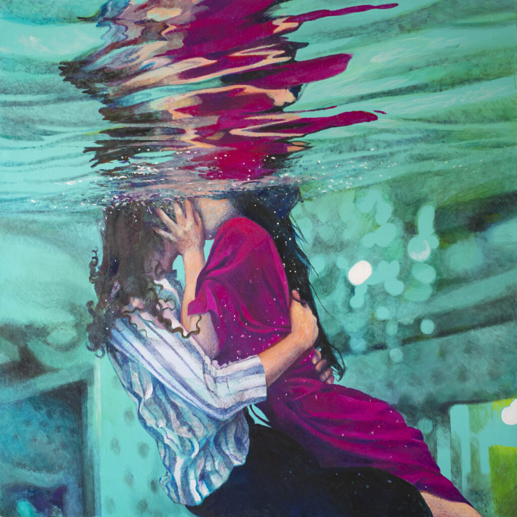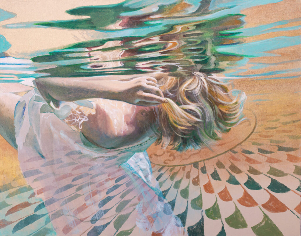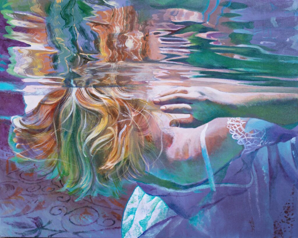 Ivana Živić is certainly not an ordinary painter of realistic motifs, she is different from all the others, among the most original, because she does not use the usual solutions of the new realists. She doesn’t paint hyperrealistically, but has her own expression, she doesn’t explore the enlarged scene and human heads, conventionally speaking the now-favorite portraiture on a large format, which can also be understood as a landscape of the human body and figure. Instead, he composes complex wholes, oil paintings that are very demanding in solving the frog’s perspective, bodily shortening and distortion, optically determined by the refraction of the scene in the water. At first glance, her visual world is realistic in appearance, but conceptually, it is moved to completely unreal, unreal environments, the painting is drowned in an aquatic atmosphere and the bodies are submerged in a watery labyrinth.