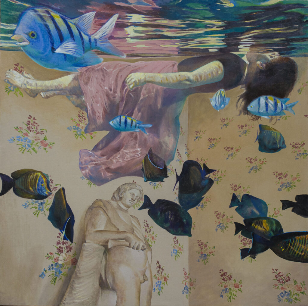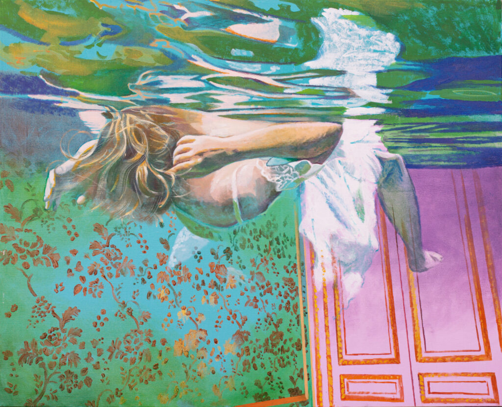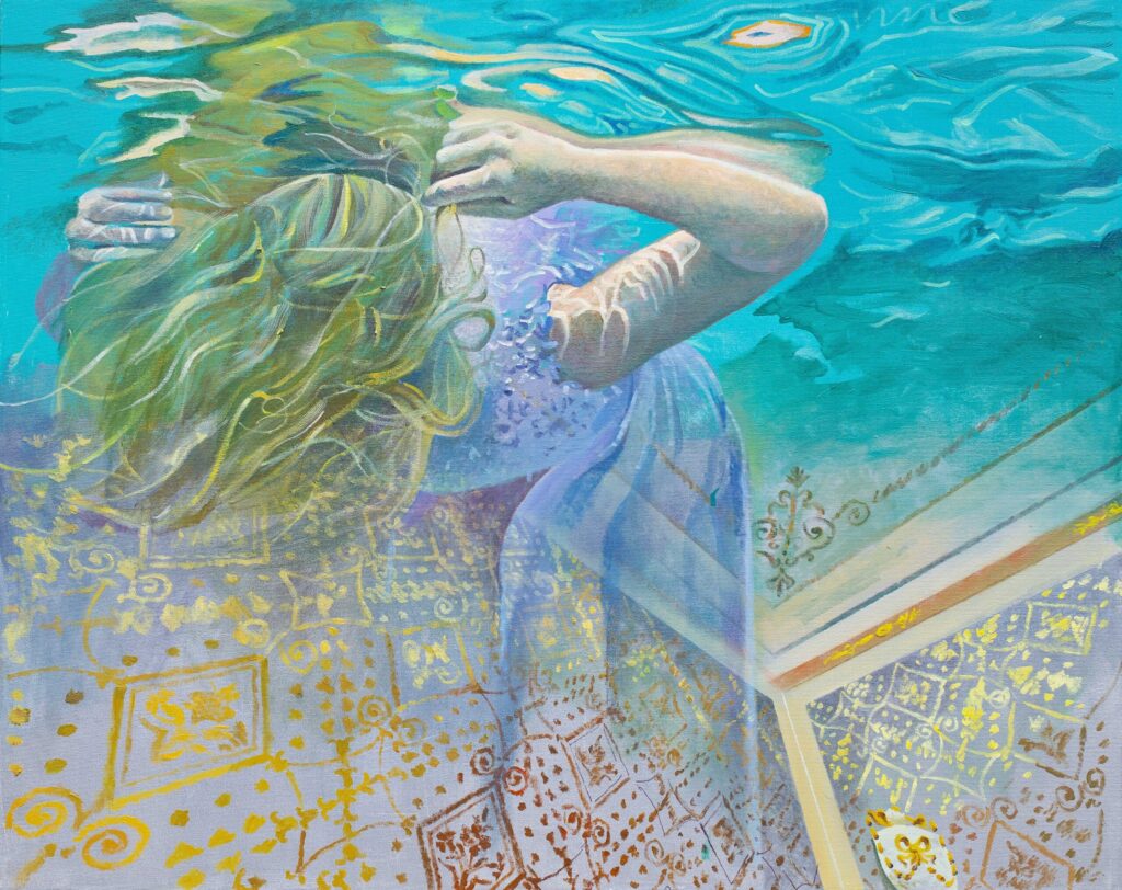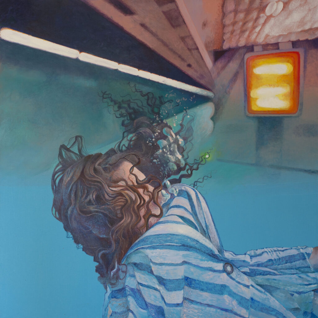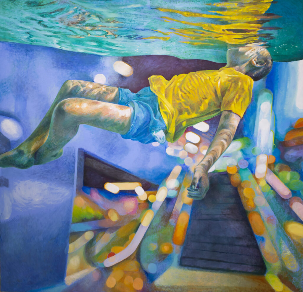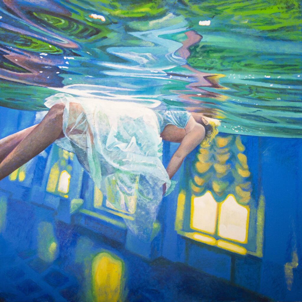 Ivana’s works are characterized by the exploration of interiors filled with water, painted with a characteristic mixture of figuration, fantasy and montage. The observer feels enveloped in these spaces inhabited by the solitary figure of a swimmer who explores the inner emotional world. Having reached a technically very high painting standard, Živić does not deal with unpleasant topics of the world around us, but resides in the world of feelings, presented through a series of highly aestheticized metaphorical spaces through which the swimmer’s body easily passes, flies and dives. The two basic building elements of the story – the swimmer and the rooms – are positioned as a natural response to an unnatural situation: the spaces seem stable and real, while the swimmer’s body appears as a blurred, unreal phenomenon, an astronaut cruising through some of her inner space.