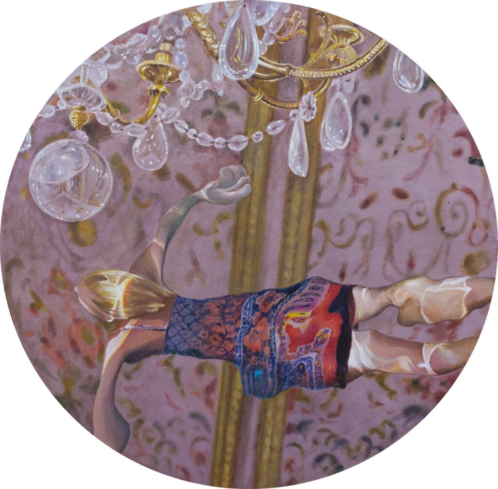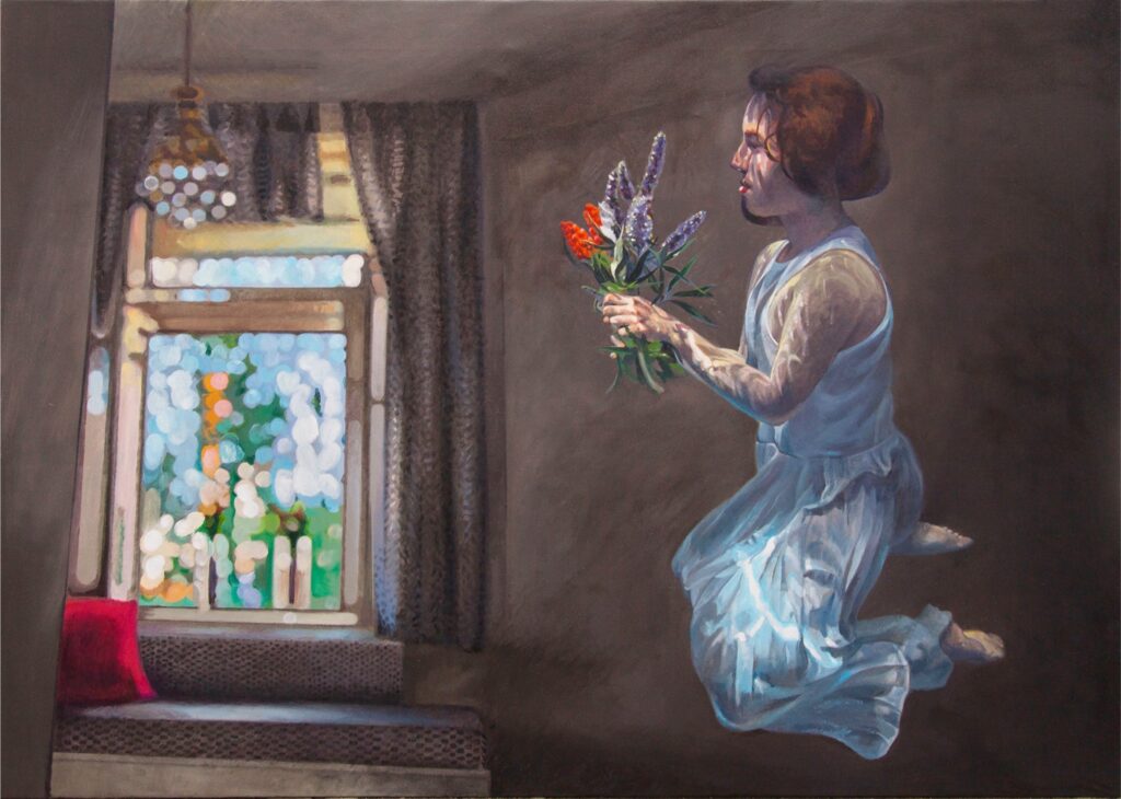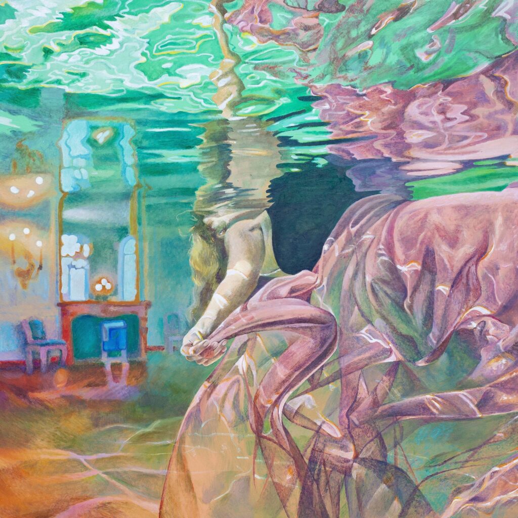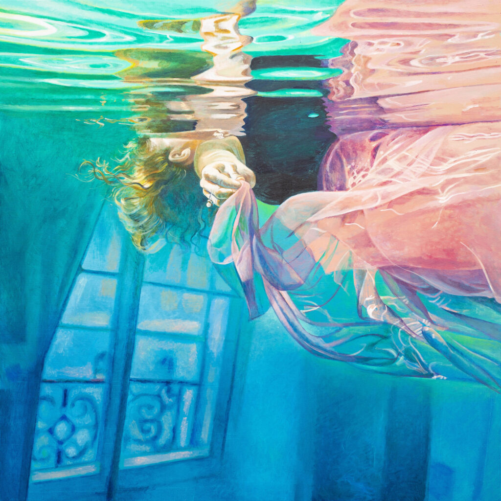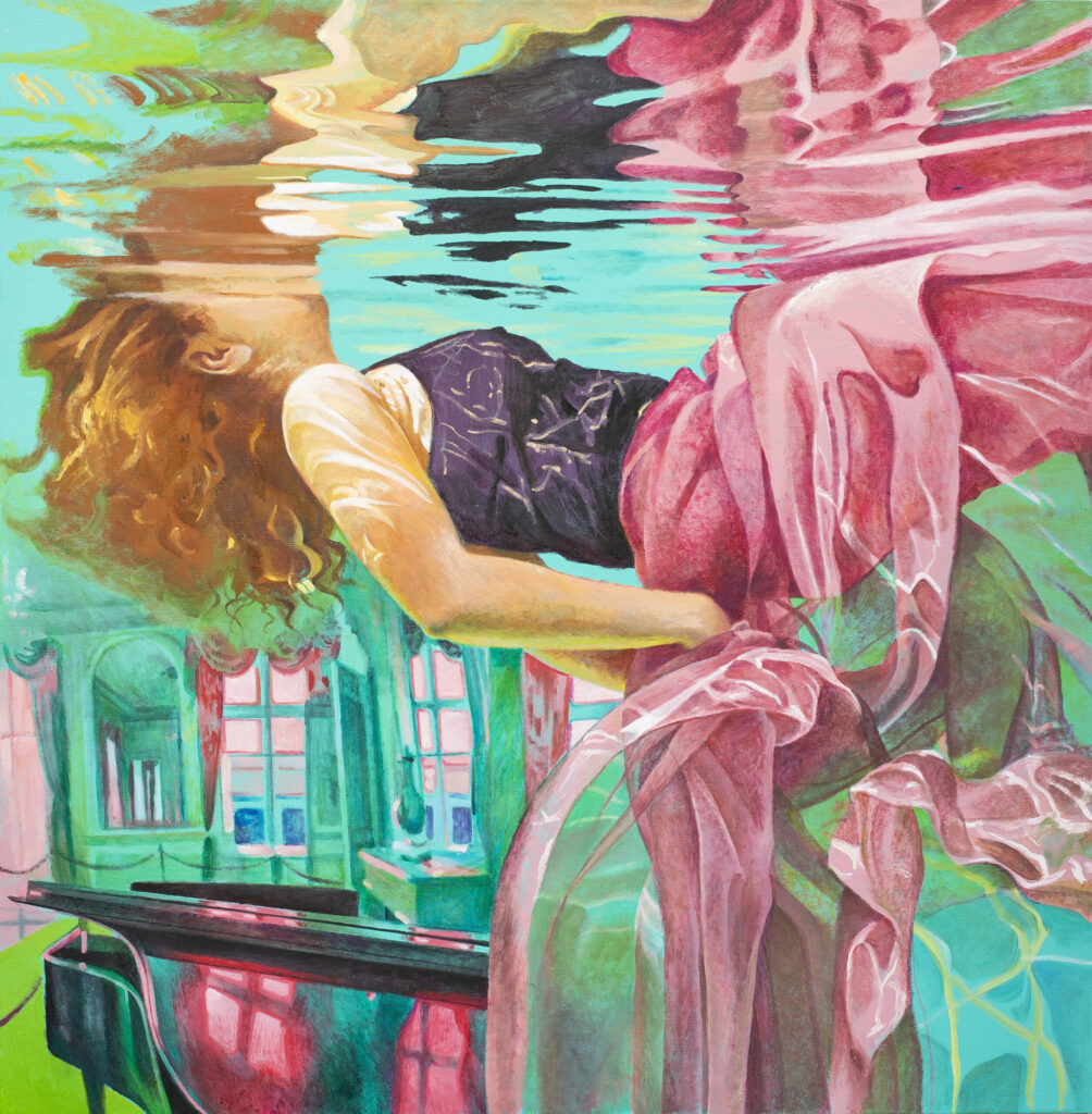 Ivana’s works are characterized by the exploration of interiors filled with water, painted with a characteristic mixture of figuration, fantasy and montage. The observer feels enveloped in these spaces inhabited by the solitary figure of a swimmer who explores the inner emotional world. Having reached a technically very high painting standard, Živić does not deal with unpleasant topics of the world around us, but resides in the world of feelings, presented through a series of highly aestheticized metaphorical spaces through which the swimmer’s body easily passes, flies and dives. The two basic building elements of the story – the swimmer and the rooms – are positioned as a natural response to an unnatural situation: the spaces seem stable and real, while the swimmer’s body appears as a blurred, unreal phenomenon, an astronaut cruising through some of her inner space.